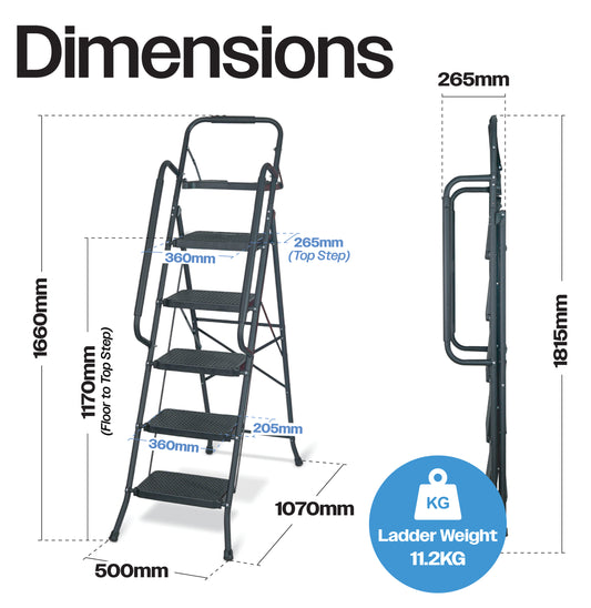 BestFor 5‑Step Ladder with Handrails & Tool Tray – Secure Folding Step Stool for Decorating, Cleaning & Loft Access
