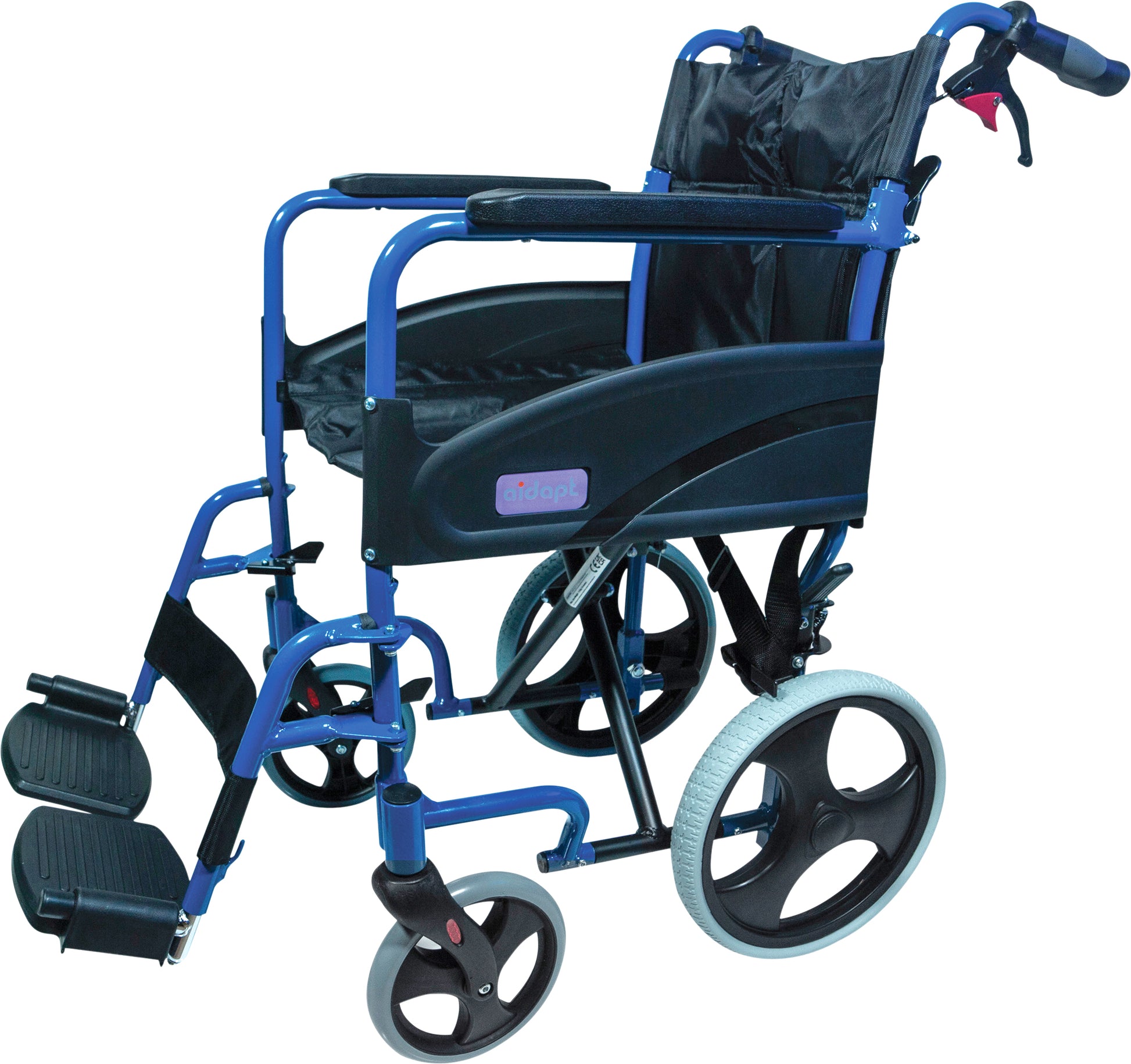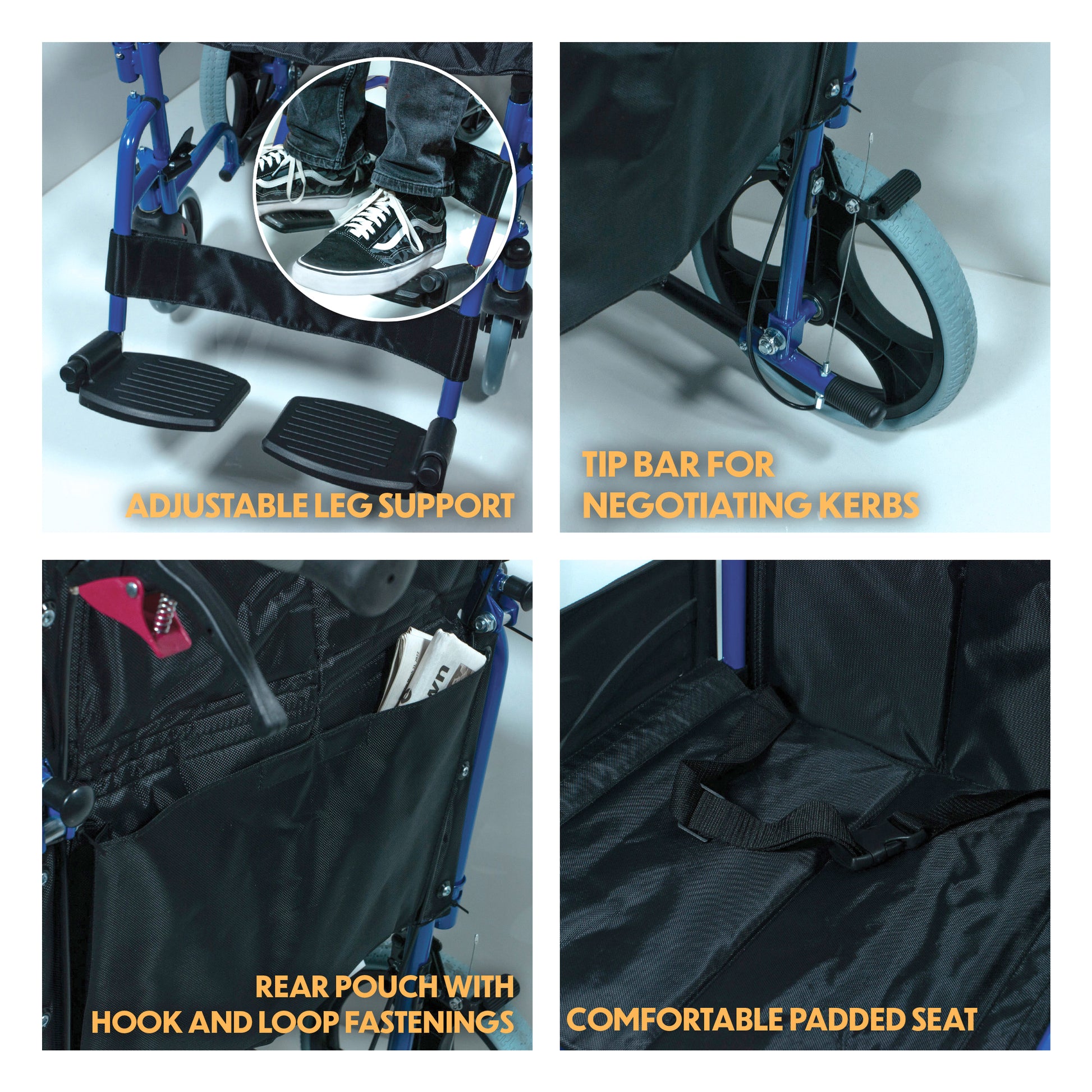 The Compact Transport Aluminium Wheelchair from Aidapt features an extremely compact and lightweight aluminium frame. This wheelchair is ideal for the occasional or first time user who wants a strong, reliable and easy to use wheelchair that will go anywhere and fold in seconds to go in the boot of your car, coach or aeroplane, making it ideal for shopping, day trips or holidays. At just over 10 kg in weight (without leg rests) and with a carrying weight of up to 115 kg, the Compact Transport Assistant Propelled Aluminium Wheelchair is a must for users who want to be independently mobile. Features include deluxe padded upholstery, fixed PU armrest for comfort, puncture proof wheels/castors, easy to use brakes and height adjustable leg rests.