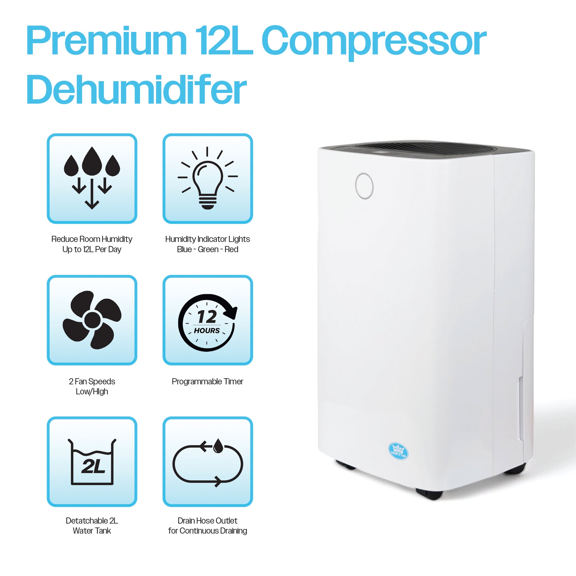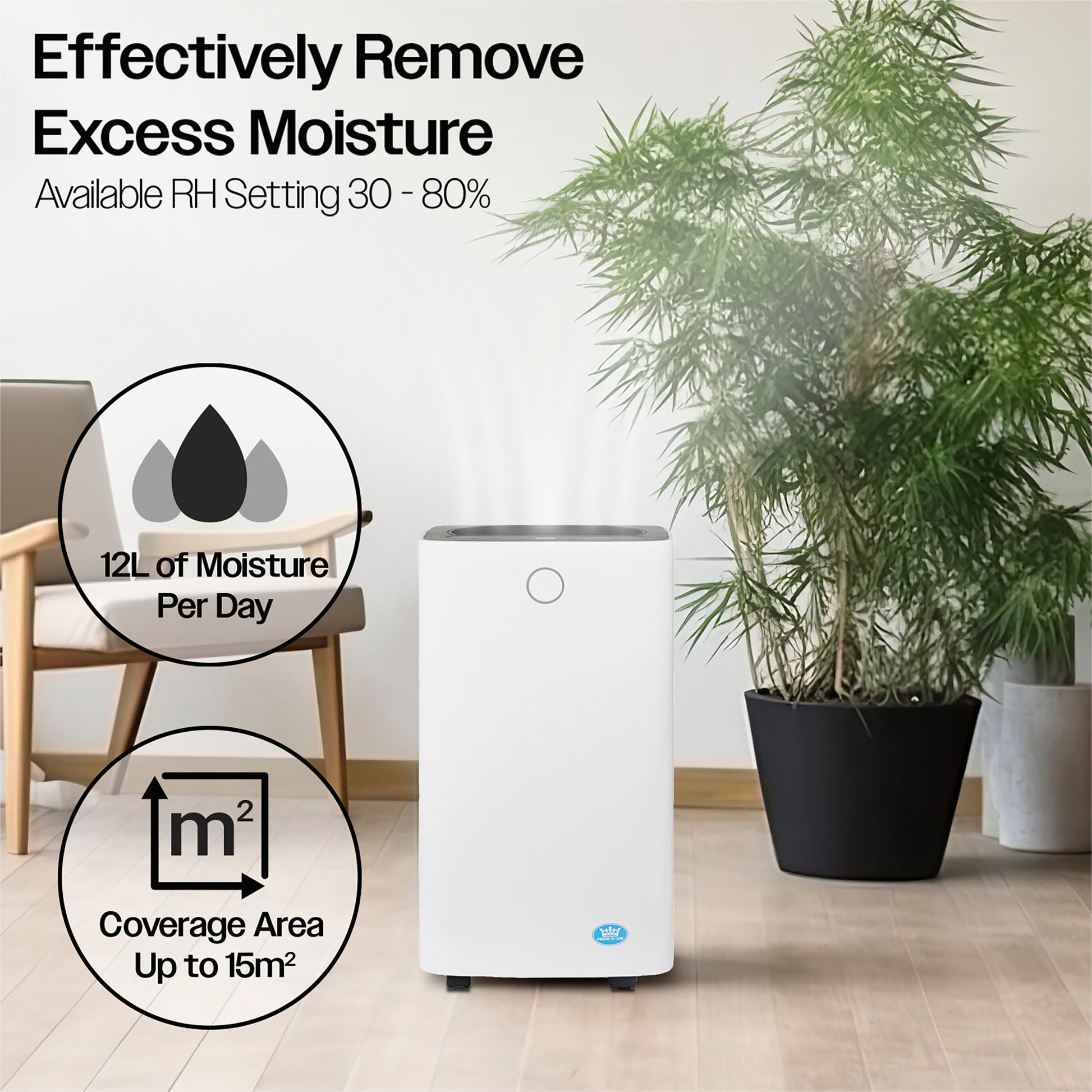 The Prem-I-Air 12 Moisture Absorbing Dehumidifier is a compact unit that can remove up to 12 L of moisture per day and is perfect for either home or office use. This attractive unit features an easy to read display and control panel for simple operation, with a variable humidity control function, allowing you to create the perfect level of humidity wherever you are. The Dehumidifier will shut down automatically when the tank is full or can be used in continuous drain mode, meaning it is suitable for operation during long periods of time without needing to be monitored.