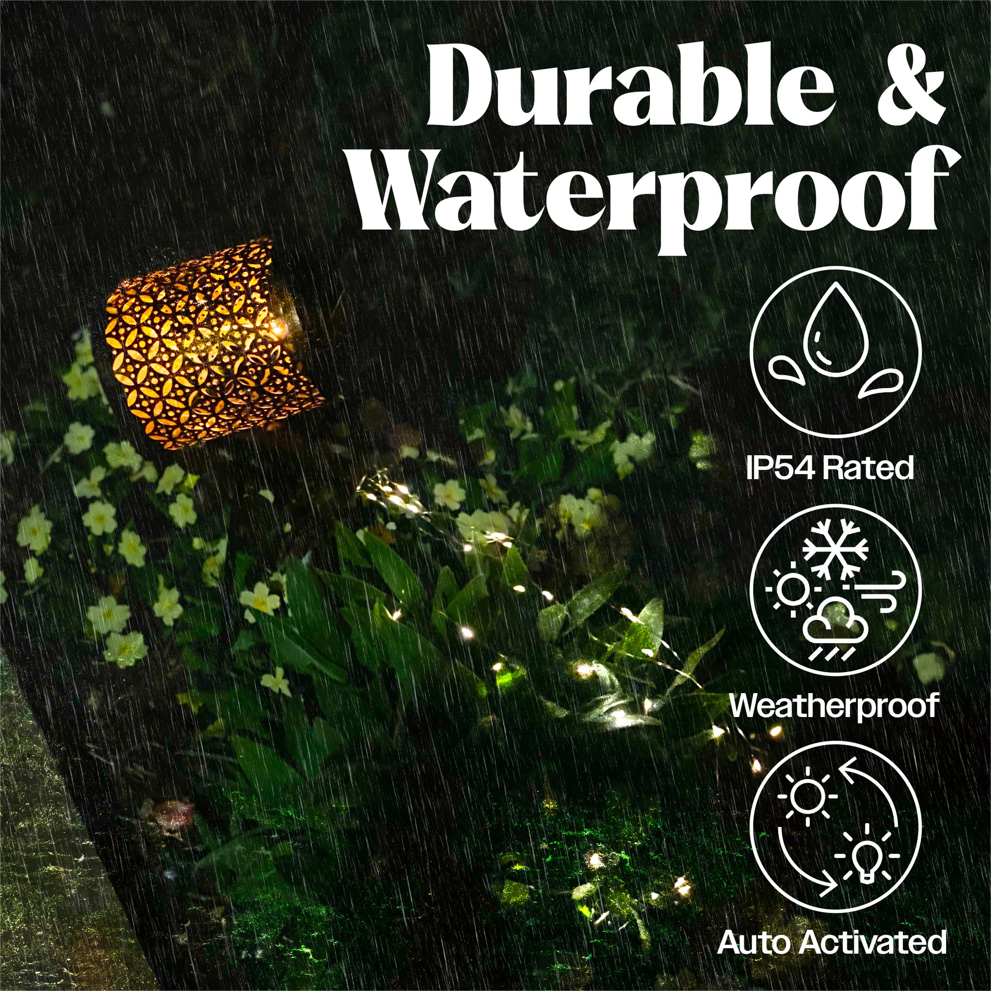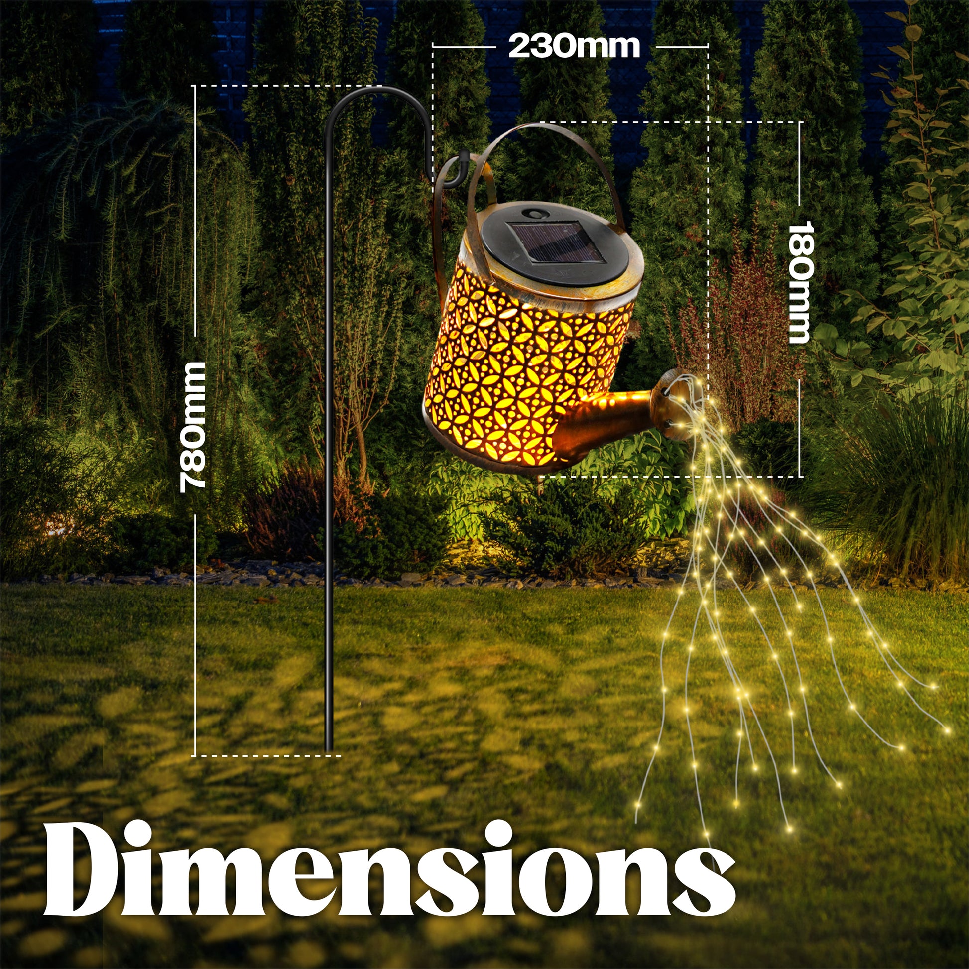 This beautiful solar watering can will enhance the look of any garden or outdoor space, the copper colouring looks great by day but night time is when the magic happens! Place the light in a sunny spot and the built-in solar panel will be charged by the sun during day light hours, when it goes dark the LED string lights and the light inside the watering can light up automatically and create a spectacular watering effect. Hang the watering can from trees, branches or decking, alternatively push the supplied spike into the ground and hang the watering can from the hook. As the watering can is charged by the sun no external power or leads are necessary making it extremely energy efficient and environmentally friendly. IP54 rated. Can be used indoors or outdoors.