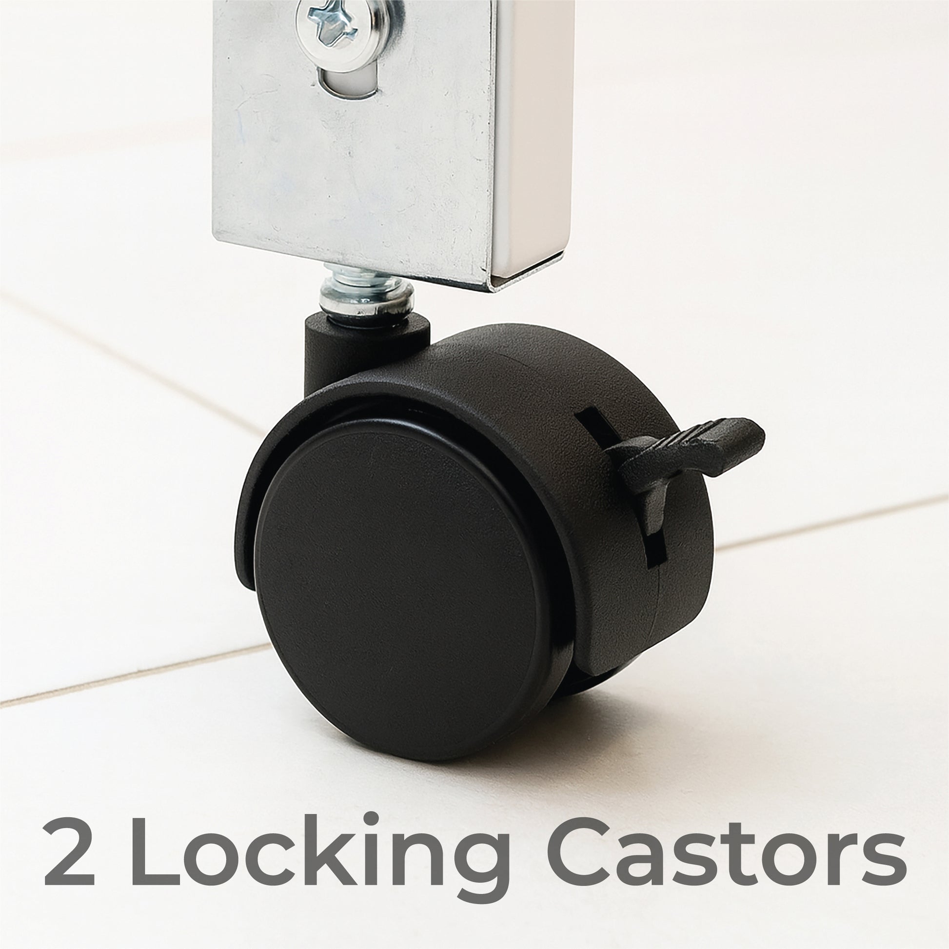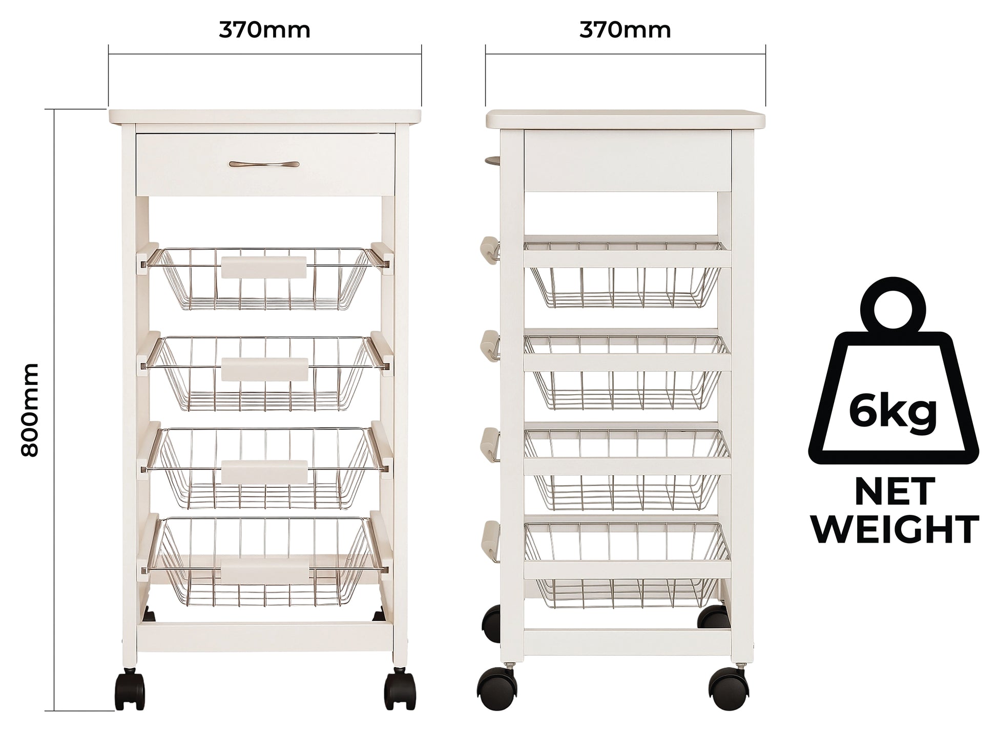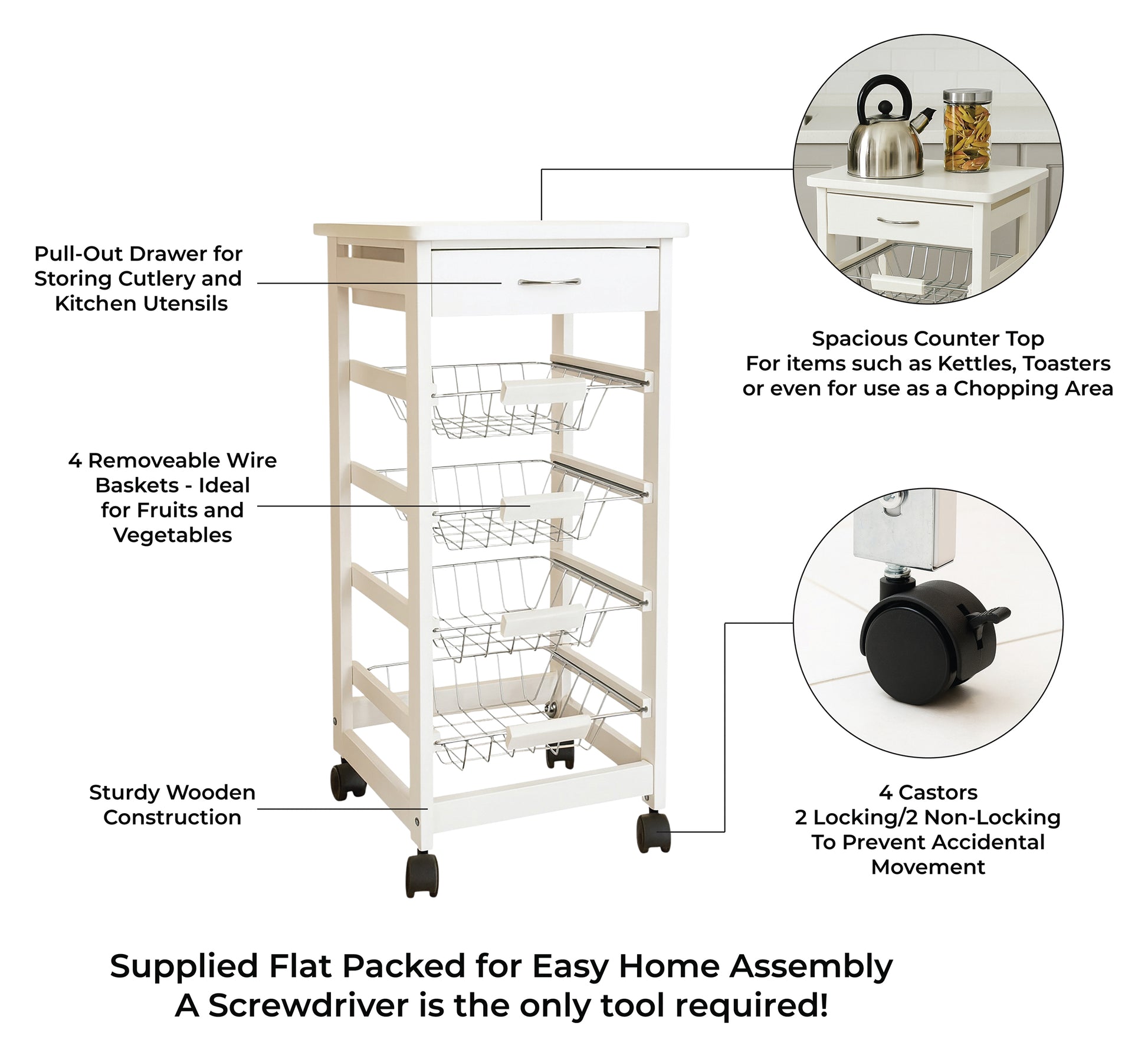 The kitchen trolley from St Helens Home and Garden is perfect for providing much needed kitchen storage space. The trolley features a counter top which can be used as extra space for appliances such as kettles and toasters or alternatively it can be used as a chopping or serving space. There are 4 wire pull out storage baskets which are neatly tucked away under the trolley each with a 25.5cm depth, they provide extra storage space for items such as fruit and vegetables or non perishable goods like tins and cereals. There is also a pull out drawer with handle which is handy for storing knives, cutlery or utensils. The 4 castors mean the trolley can be transported easily around your kitchen and 2 of the castors can be locked to ensure the trolley does not move when you dont want it to. The white finish gives the trolley a stylish and clean look making it suitable for any kitchen regardless of your colour scheme.